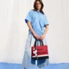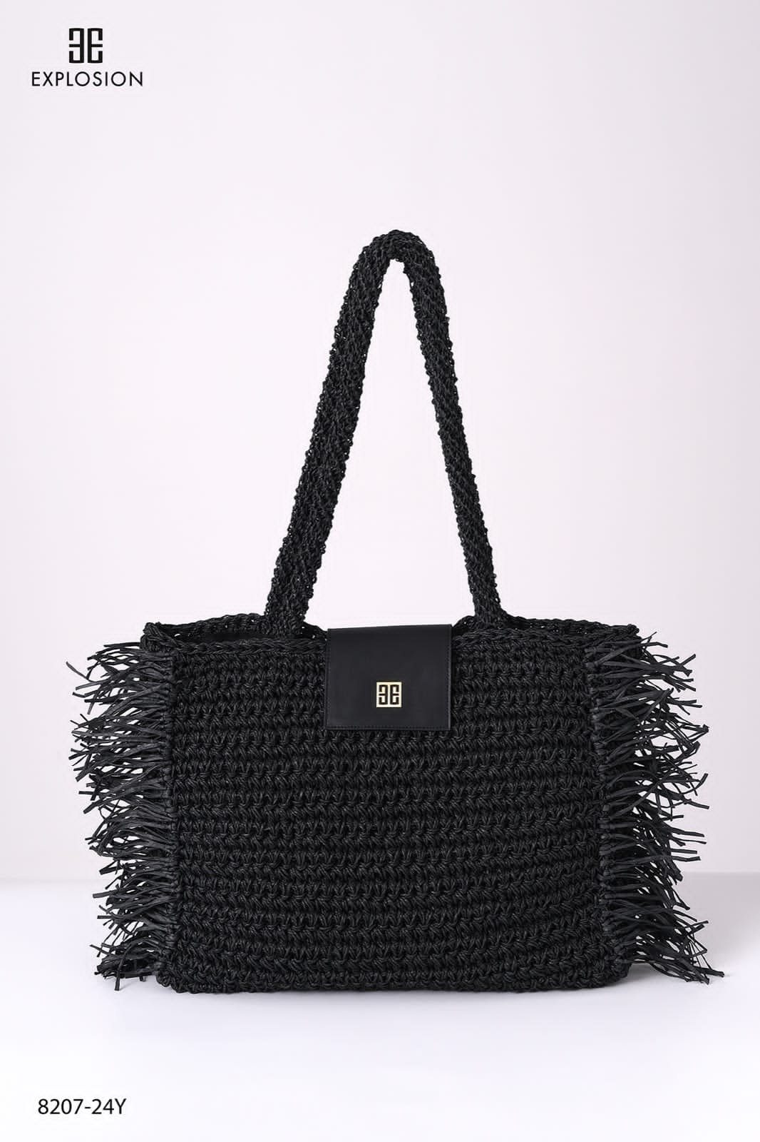 A modern twist on classic raffia, this black woven tote brings effortless chic to your everyday style. Designed with structured handles for comfortable carry, it features playful fringed edges for a touch of movement and texture. The sleek flap closure, finished with a gold-toned logo accent, adds a refined edge to its natural, handcrafted feel. Spacious and versatile, this bag is perfect for day-to-night transitions, travel, or a stylish beachside look.