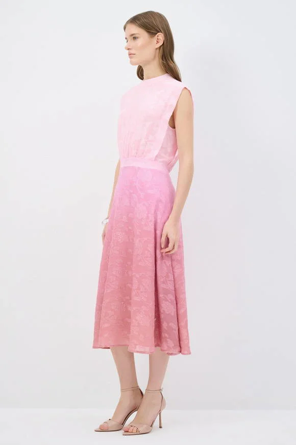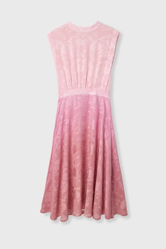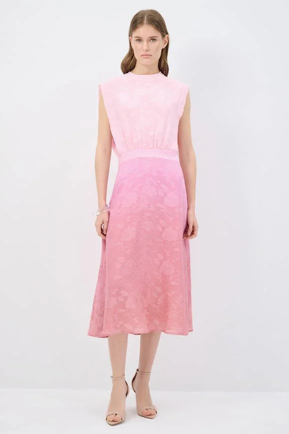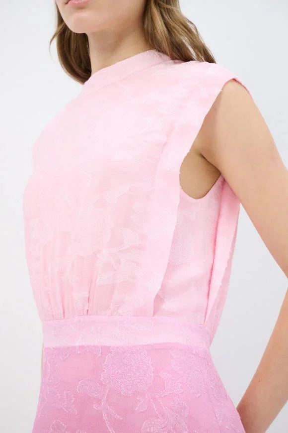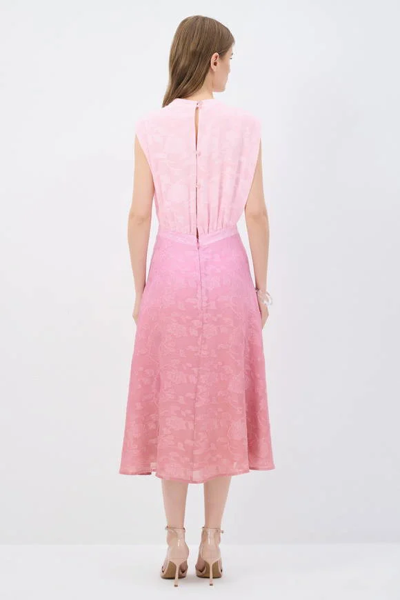 Step into effortless sophistication with this sleeveless jacquard midi dress in soft pink. Featuring a structured high neckline, a cinched waistline, and a flowing A-line skirt, it flatters the figure while offering graceful movement. The subtle floral jacquard pattern adds a refined touch, perfect for daytime elegance or evening occasions. Finished with a button-down detail at the back, this dress combines modern minimalism with timeless femininity.