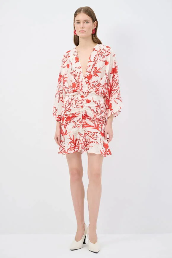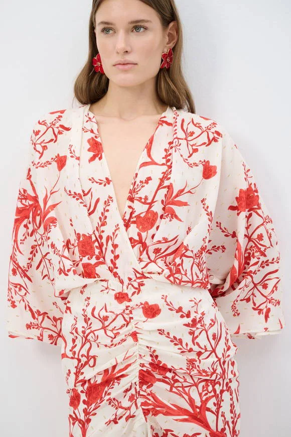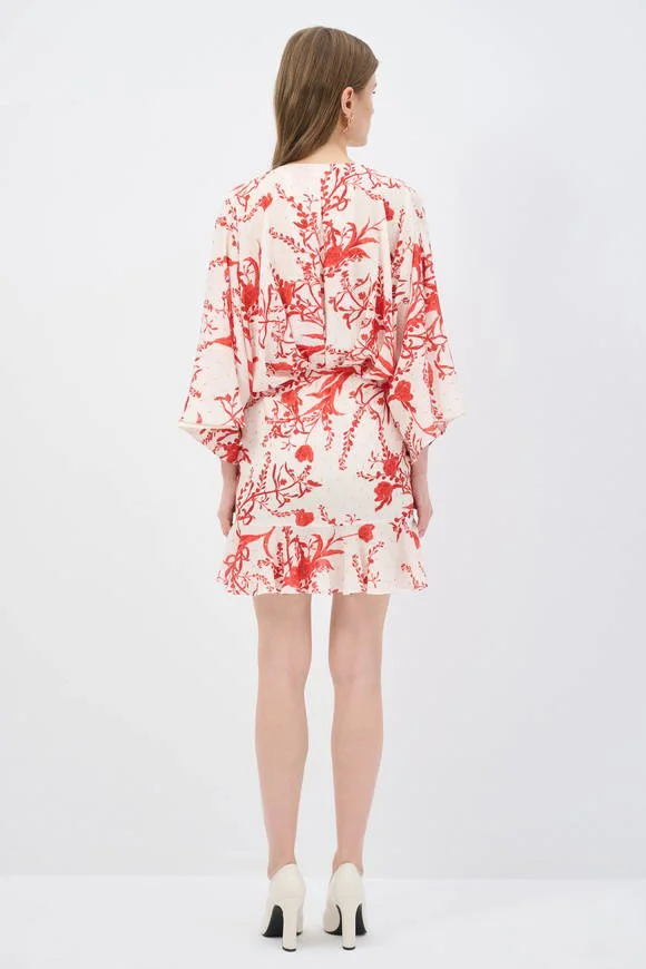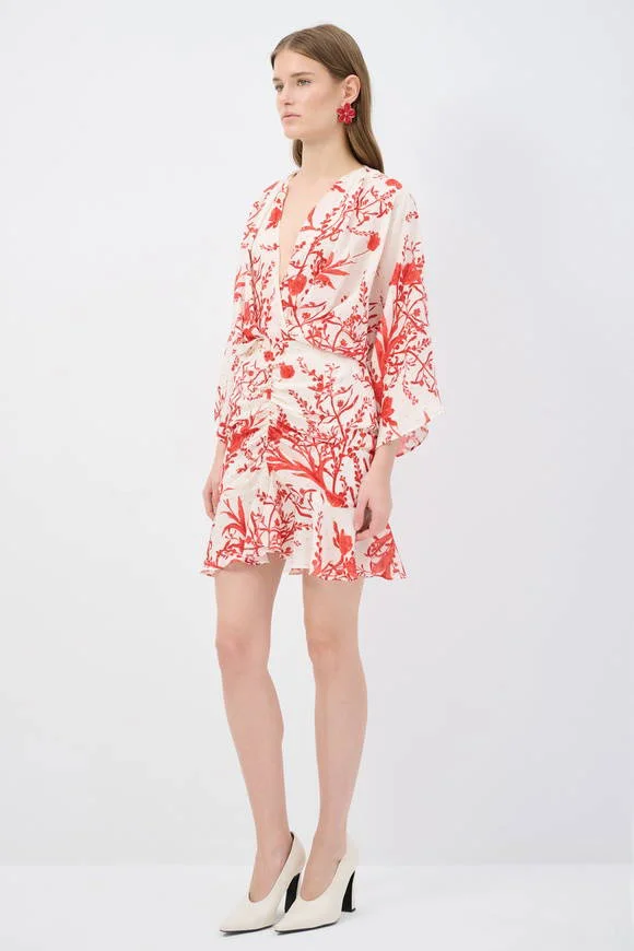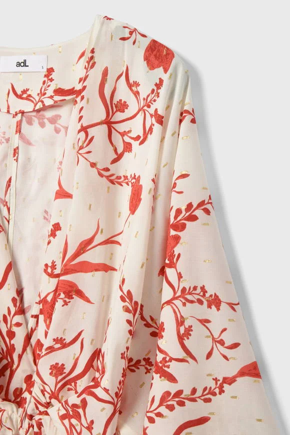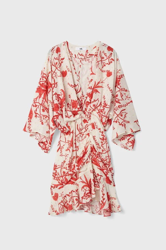 Effortlessly chic, this wrap mini dress features a vibrant red botanical print on a crisp white base. Designed with a deep V-neckline, flowy kimono-style sleeves, and a flattering gathered waist, it creates a feminine silhouette with ease. The soft, lightweight fabric ensures all-day comfort, while the subtle ruffled hem adds a playful touch. Perfect for brunch dates, summer evenings, or vacation strolls.