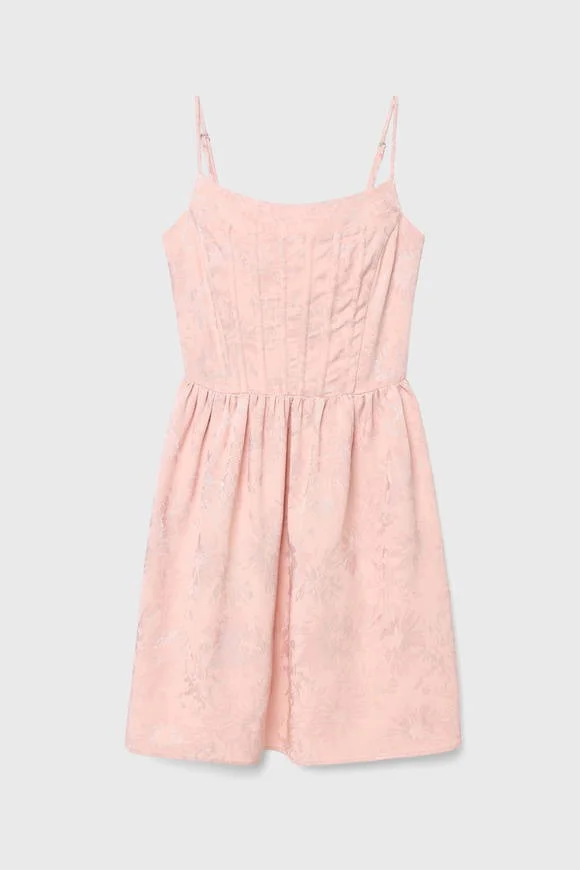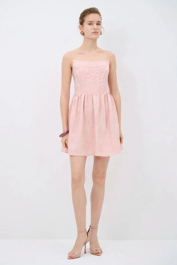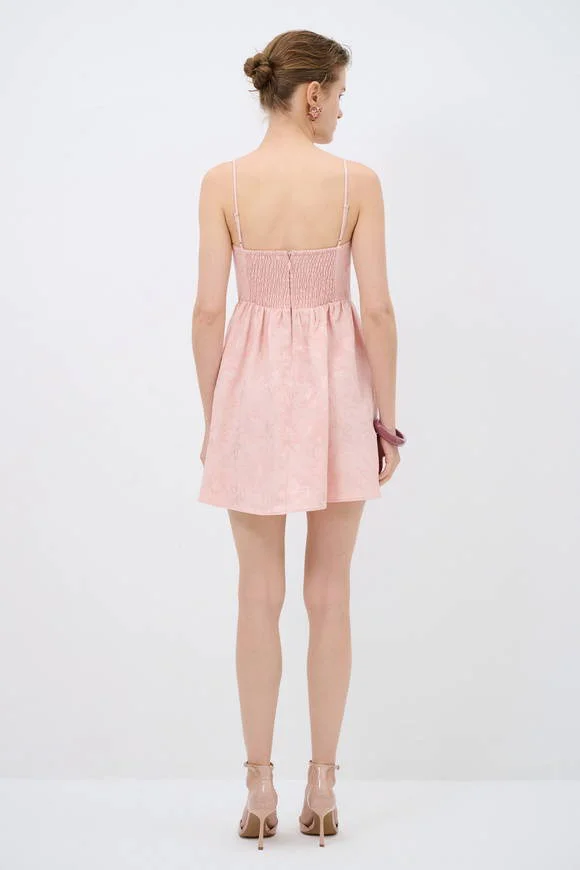 Delicate and feminine, this mini dress is crafted from soft jacquard fabric with a subtle floral texture. Featuring a structured bodice with slim spaghetti straps and a gently flared skirt, it creates a flattering silhouette that’s perfect for both daytime outings and evening occasions. Its pastel pink hue adds a touch of romance, making it an effortless choice for summer gatherings, date nights, or special celebrations.