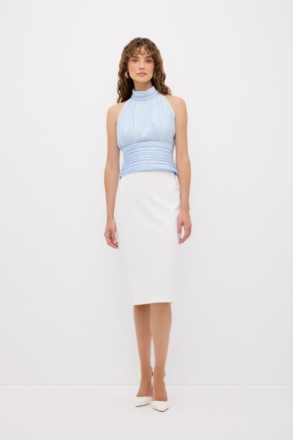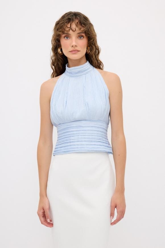Elevate your wardrobe with this elegant halter neck top, crafted in a soft light blue hue. Featuring a high gathered neckline with a tie-back detail, it combines sophistication with effortless charm. The pleated bodice flows into a fitted, ruched waistband that beautifully defines the silhouette, offering both comfort and style.