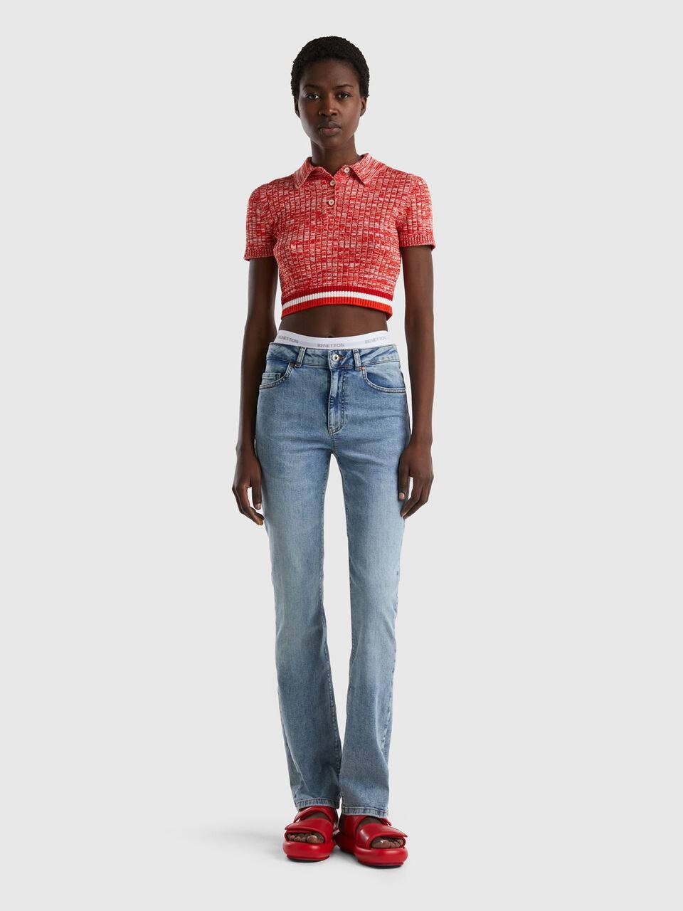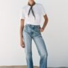 Crafted in a light blue wash, these slim-straight jeans offer the perfect balance between comfort and style. Designed with a mid-rise fit, they hug the hips and thighs before falling into a relaxed straight leg that flatters every silhouette. A timeless wardrobe essential you can dress up or down with ease.