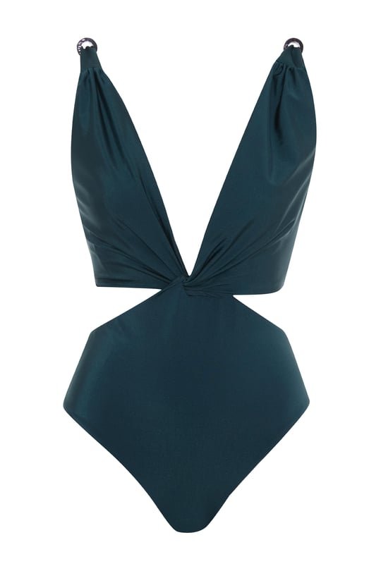 Make a statement by the water in this sleek one-piece swimsuit. Designed with a daring deep V-neckline and flattering cut-out waist, it sculpts the figure while offering modern elegance. The shoulder straps are accented with metallic ring details, adding a chic touch. Crafted from smooth stretch fabric, this style combines comfort and allure—perfect for poolside lounging or beach escapes.