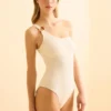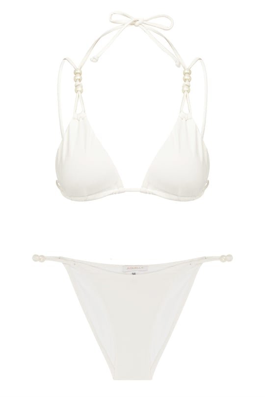 Elevate your swimwear edit with this chic white bikini set. The halter-neck triangle top features delicate pearl bead details on the straps, adding a touch of elegance to a classic silhouette. Paired with matching tie-side bottoms, this set blends simplicity with sophistication, making it a timeless choice for beach days and poolside lounging. Crafted from smooth, quick-drying fabric, it ensures both comfort and style for your summer wardrobe.