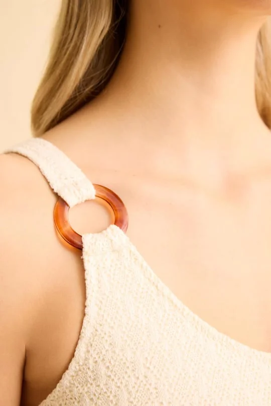 Make a statement by the poolside with this elegant one-shoulder swimsuit. Designed in a soft textured fabric, it features a flattering asymmetric neckline and a chic tortoiseshell ring detail on the strap for a modern touch. The full coverage back and high-cut leg offer both comfort and elongation, making it the perfect balance of style and sophistication.