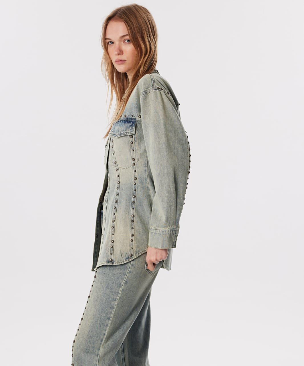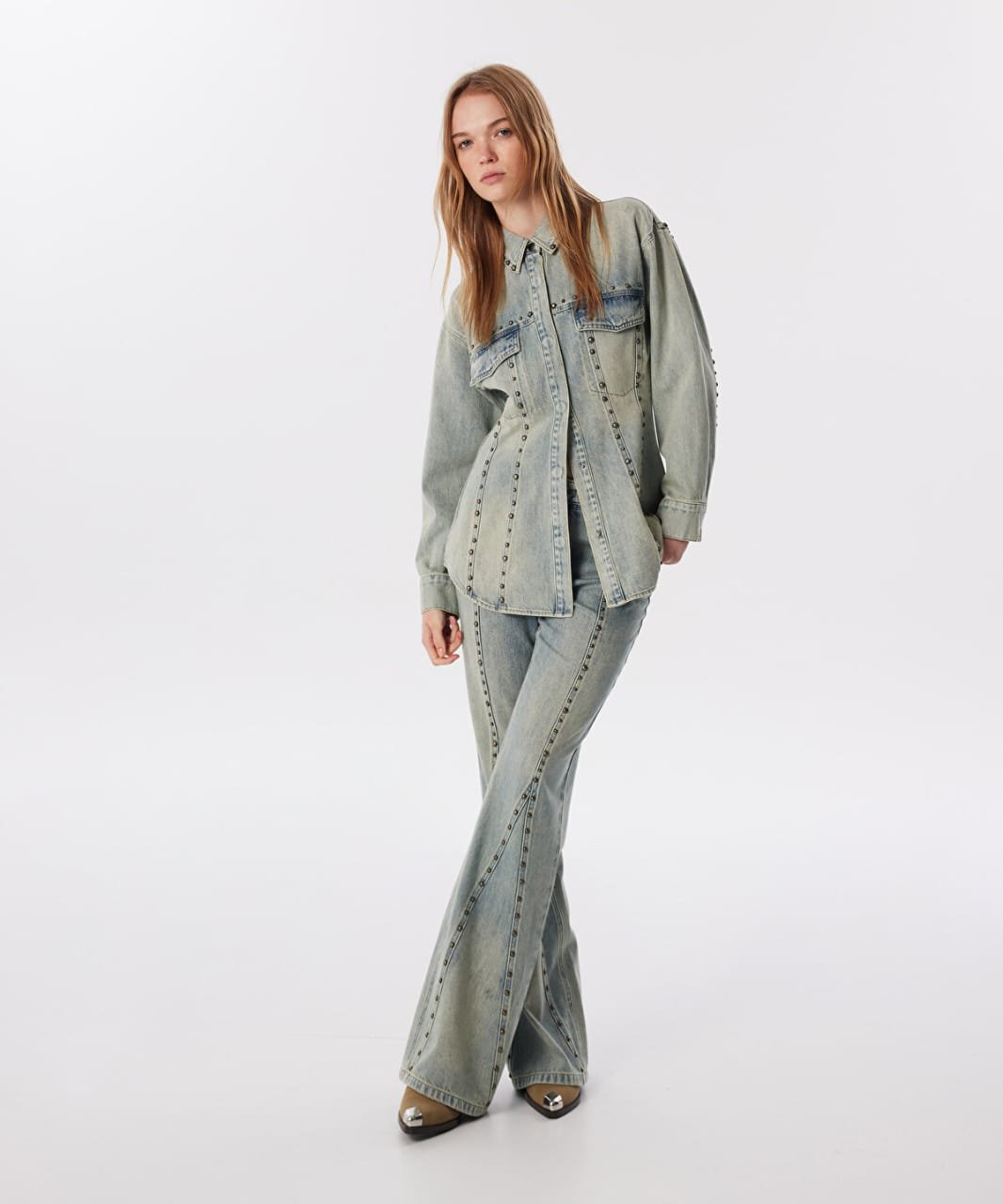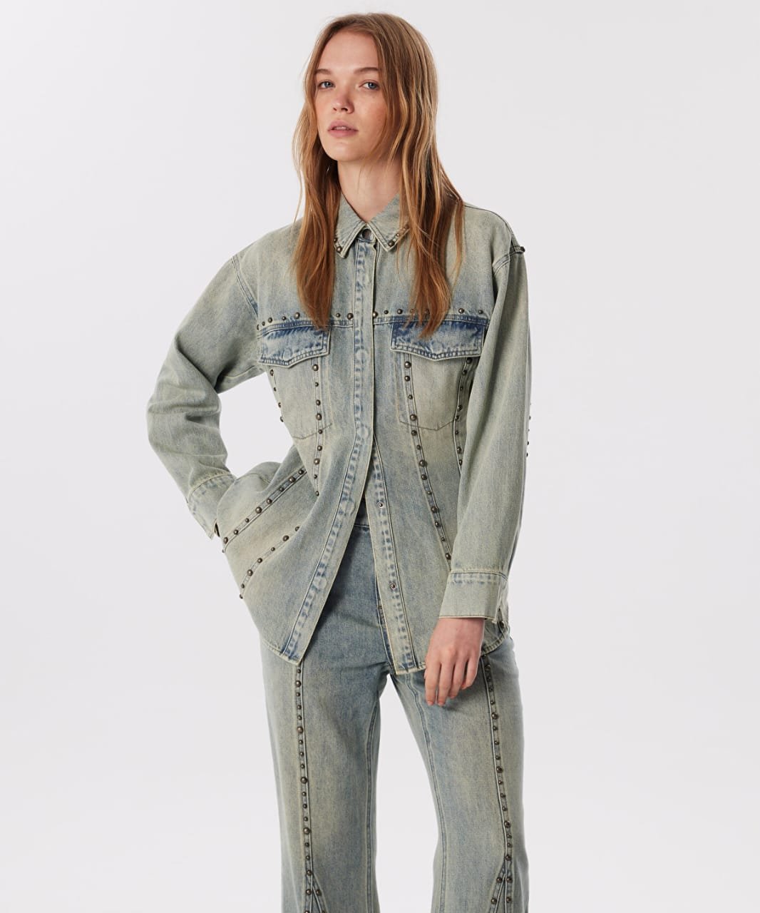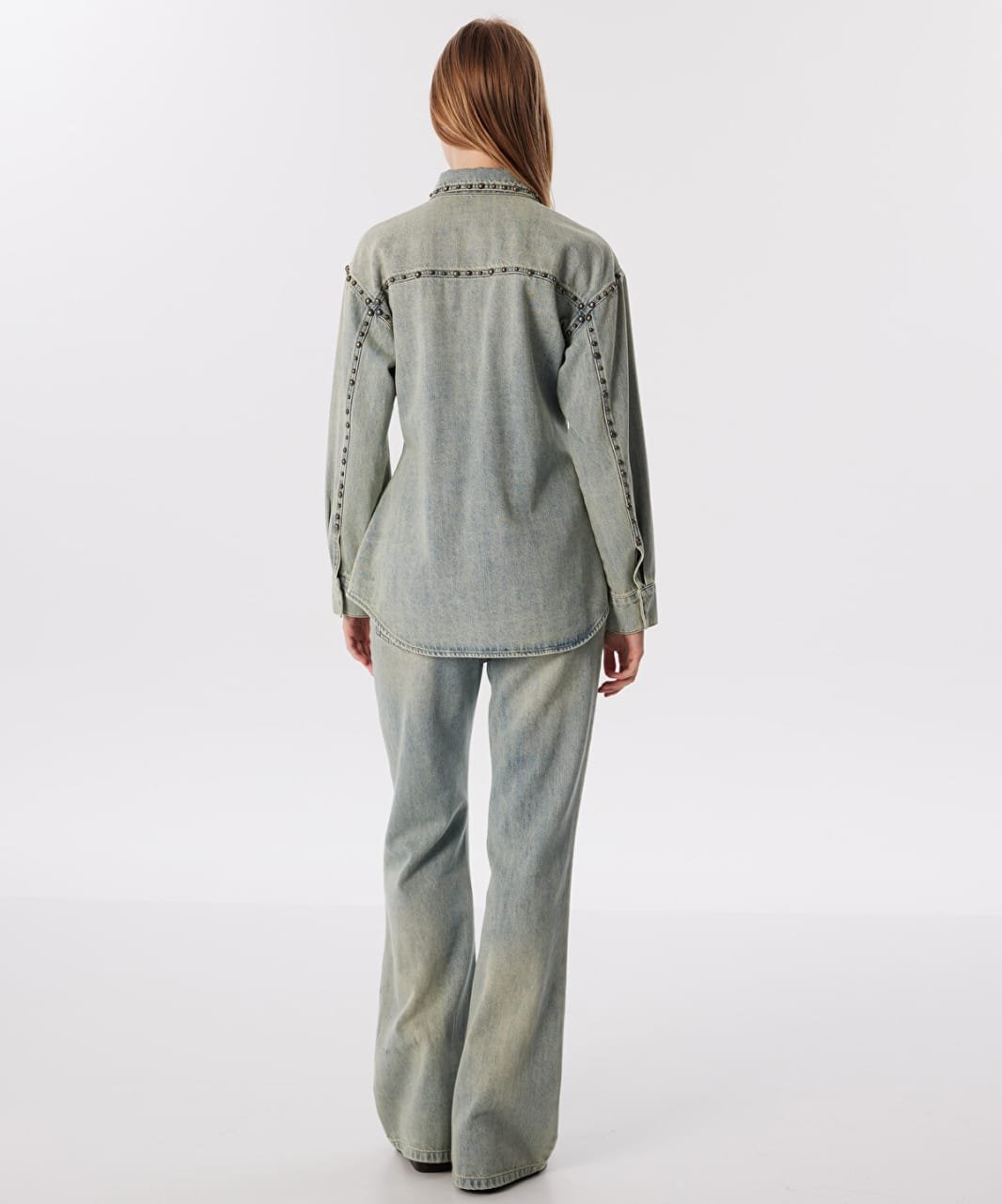 Effortlessly edgy, this denim shirt and matching pants set redefines casual style with a bold twist. Designed in a light vintage wash, the set is detailed with all-over stud accents that contour the silhouette and add a touch of rebellious charm. The shirt features flap chest pockets and a relaxed fit, while the pants are tailored with straight legs for a laid-back yet structured feel. A versatile co-ord that can be worn together for a statement look or styled separately for endless outfit combinations.