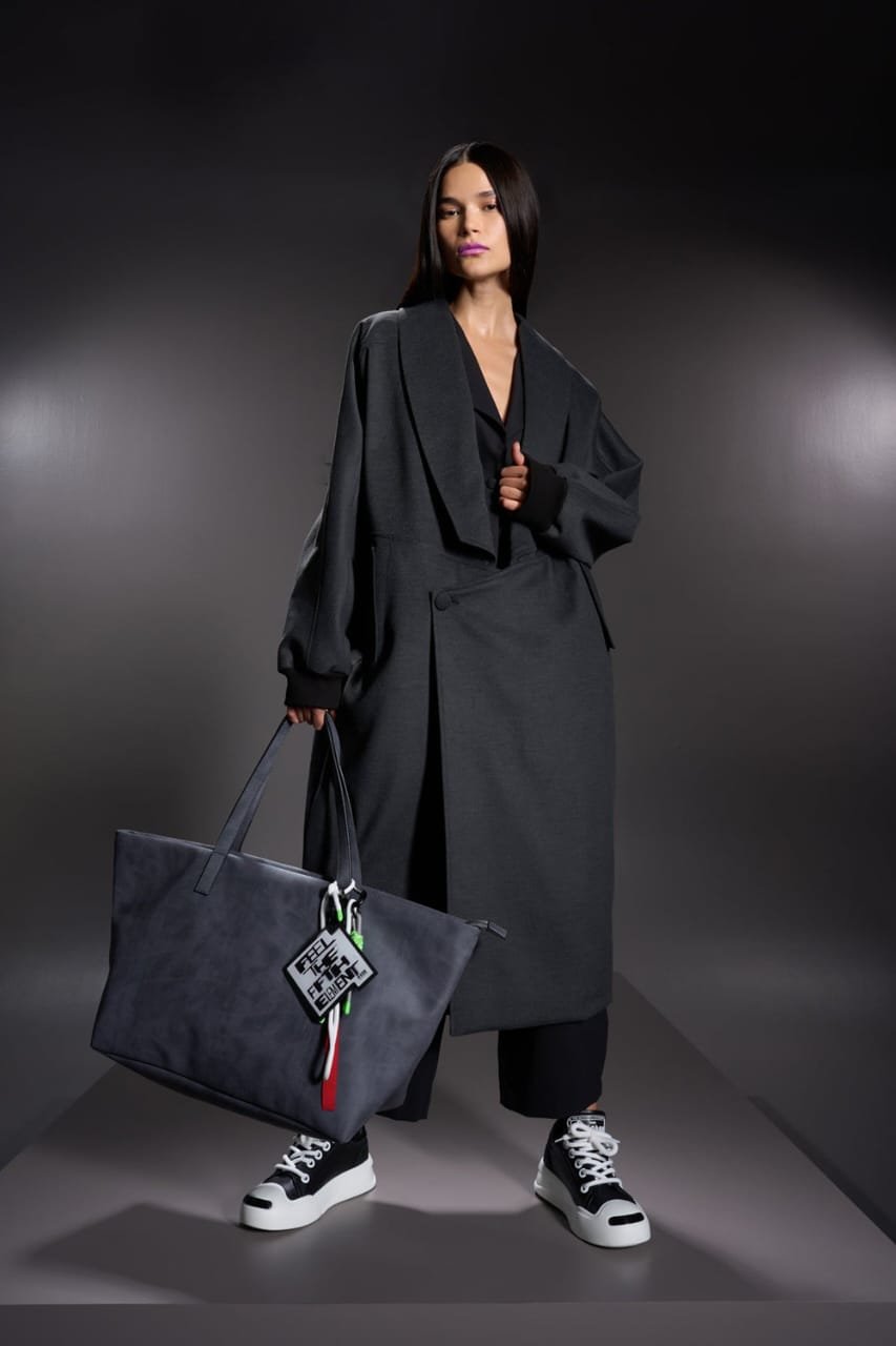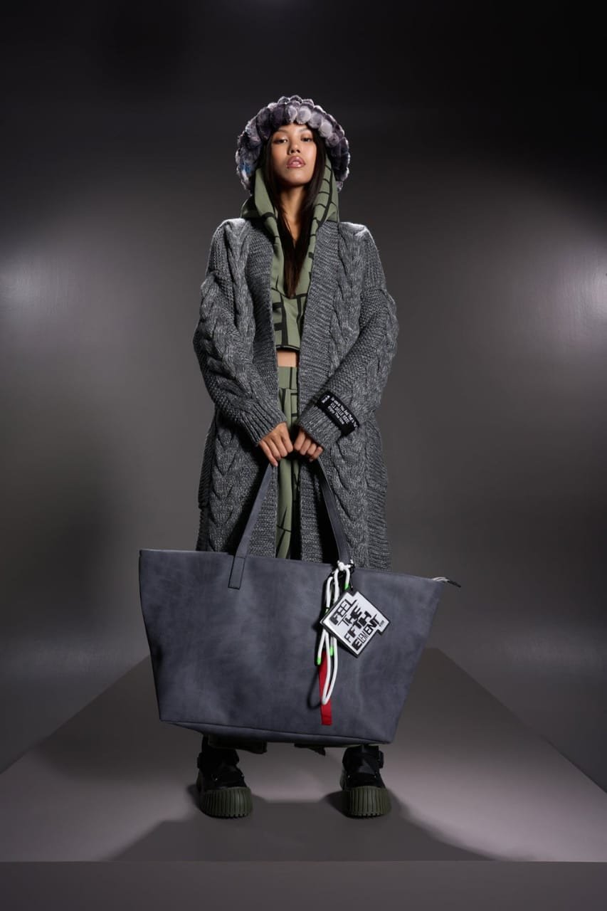 The double top handles ensure comfortable wear, while the front is accented with bold detachable keychains and tags that add a modern, urban edge. Minimalist at the back with a subtle embossed logo detail, this tote balances functionality with fashion-forward design.