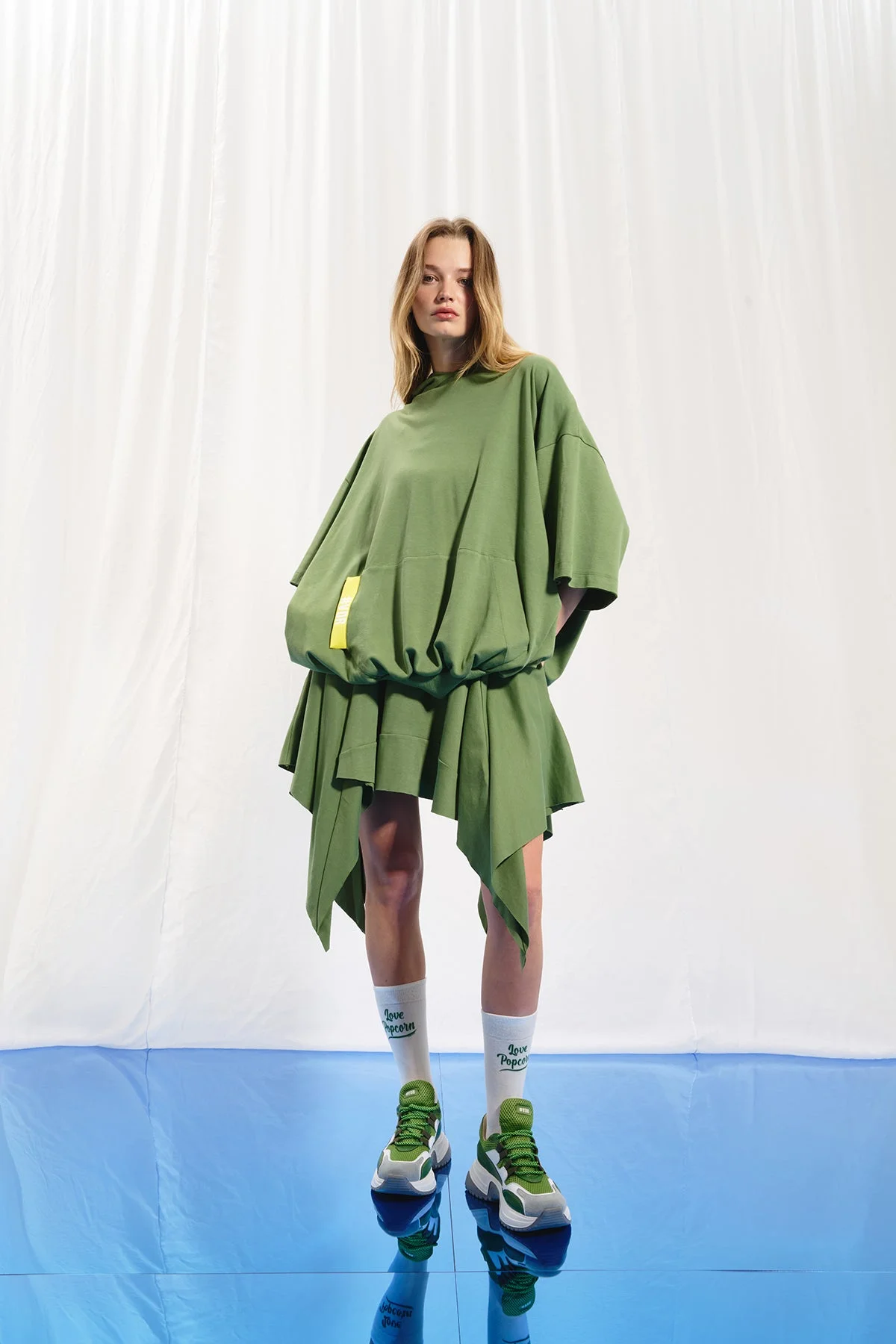 Effortlessly cool and street-style inspired, this oversized hoodie dress comes in a bold green tone with a relaxed fit and draped hemline. Designed with wide sleeves and a comfortable hood, it features a statement back embroidery with a colorful peace sign motif for an urban edge. Perfect to wear straight and loose for a laid-back vibe, or styled with sneakers for an everyday sporty look.