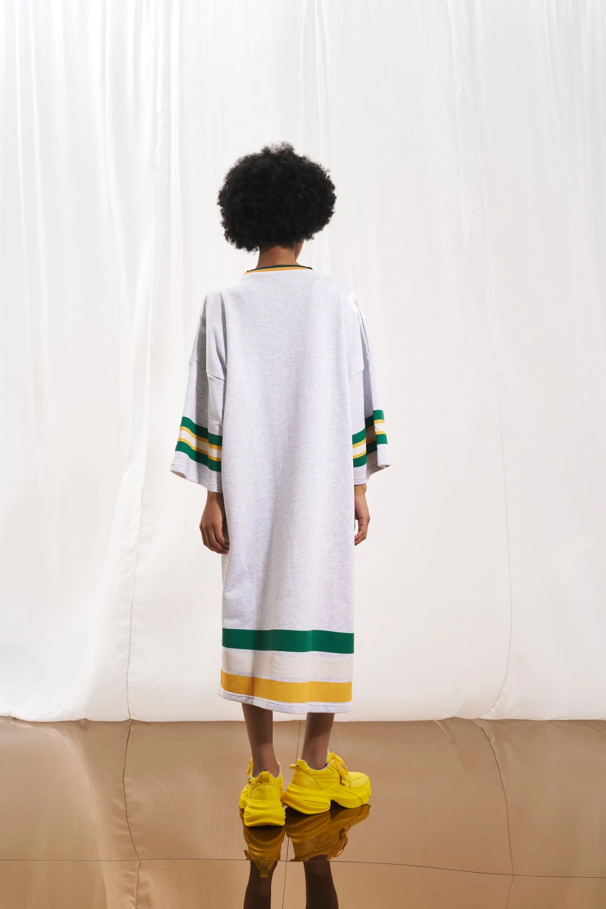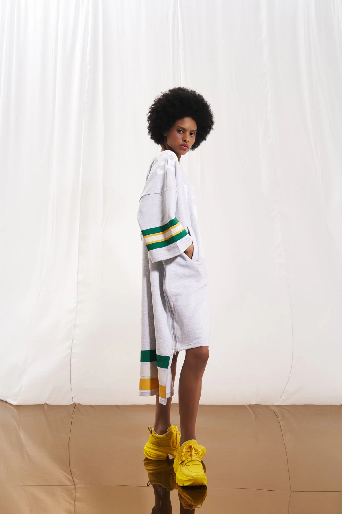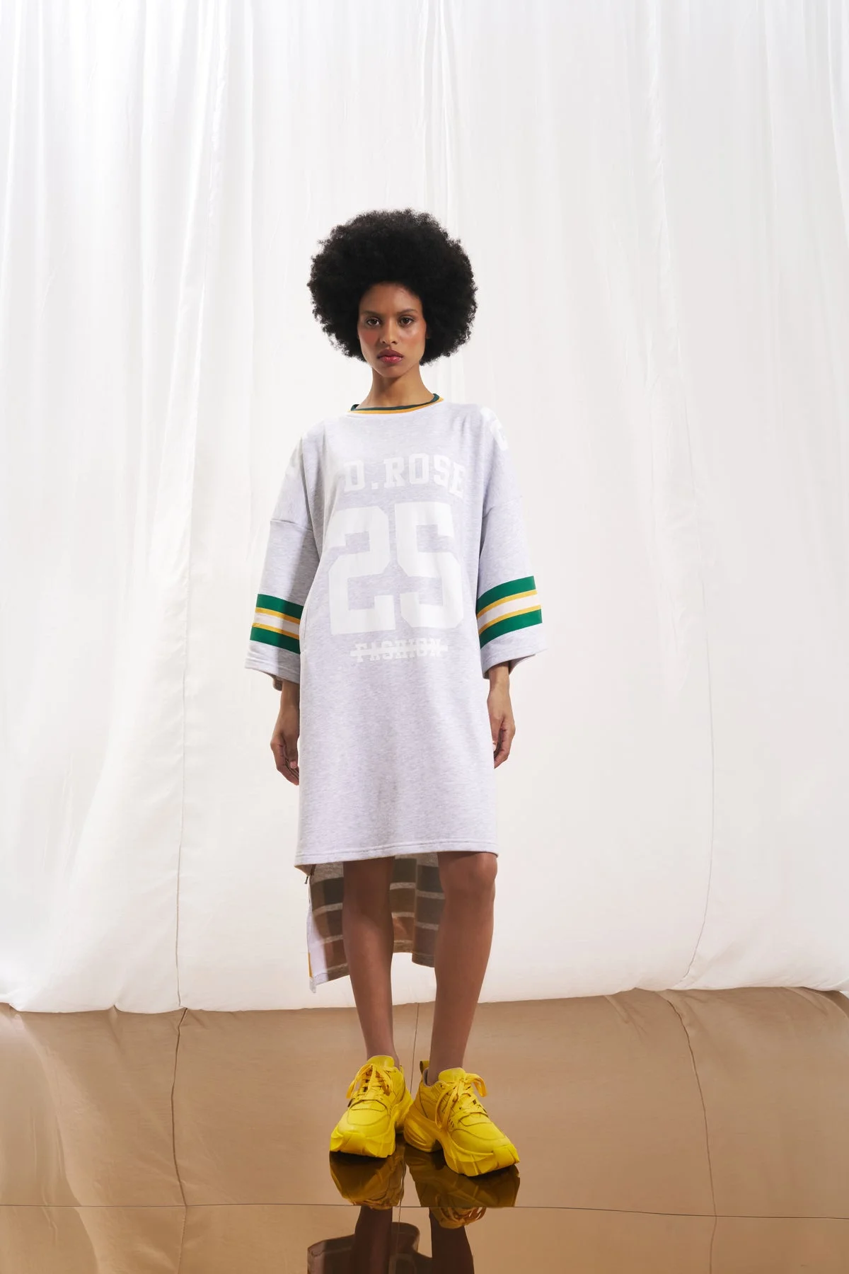 Sporty meets chic in this oversized jersey dress, designed with a relaxed fit and effortless streetwear appeal. Crafted from soft heather-grey cotton, it features bold varsity-style details including a front “25” graphic, lettered accents, and contrast stripes in green and yellow at the sleeves and hem. The drop shoulders and wide three-quarter sleeves add to its laid-back silhouette, while discreet side pockets keep it functional. A high-low hem with zip detail at the back completes the look, making it perfect for casual days or styling up with statement sneakers.
