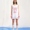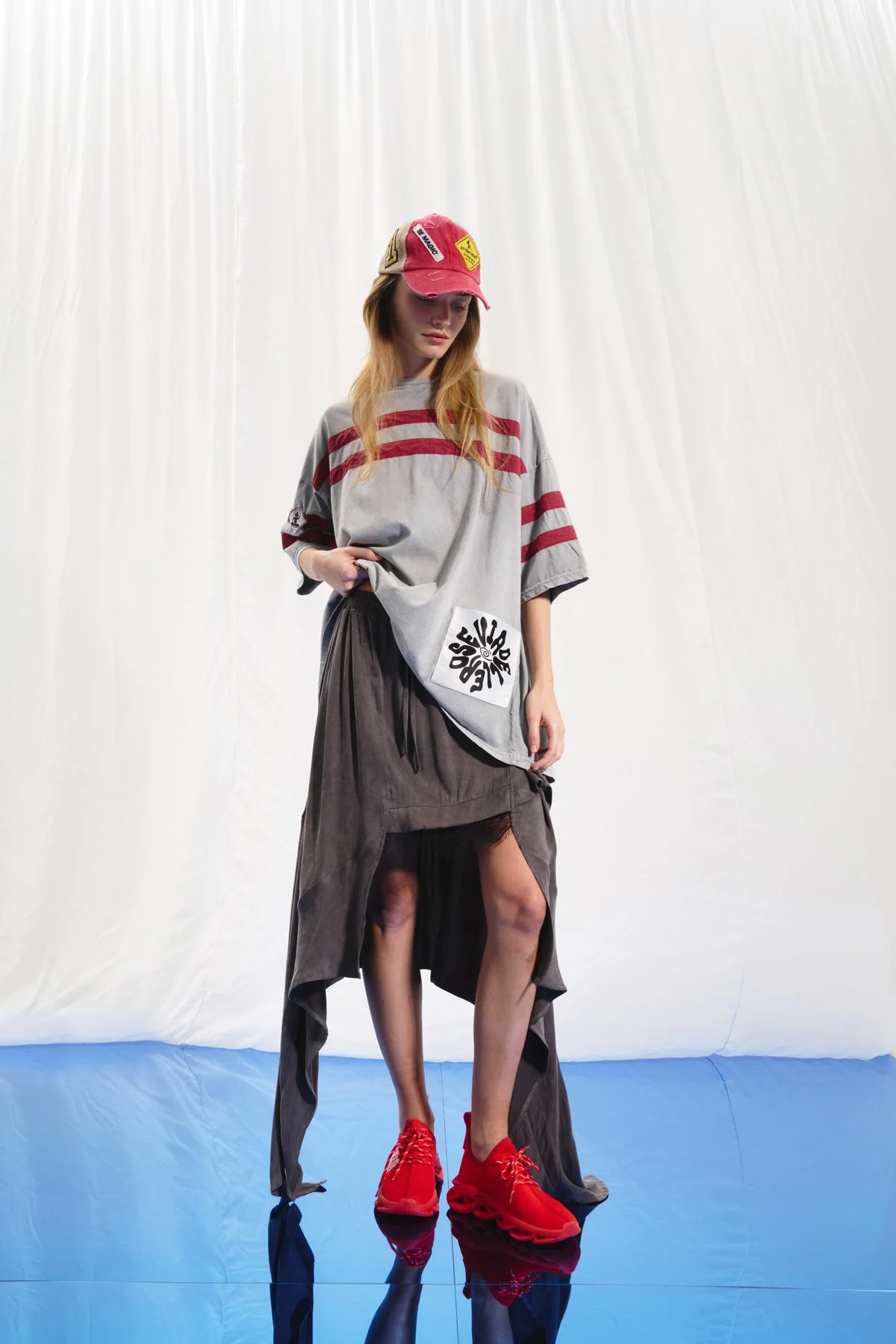 relaxed, oversized T-shirt designed with a sporty edge. Featuring bold contrasting stripes across the chest and sleeves, plus a graphic detail at the hem for a streetwear finish. Cut from soft, breathable cotton for all-day comfort, this piece is perfect for layering or wearing solo with a statement bottom.