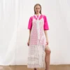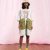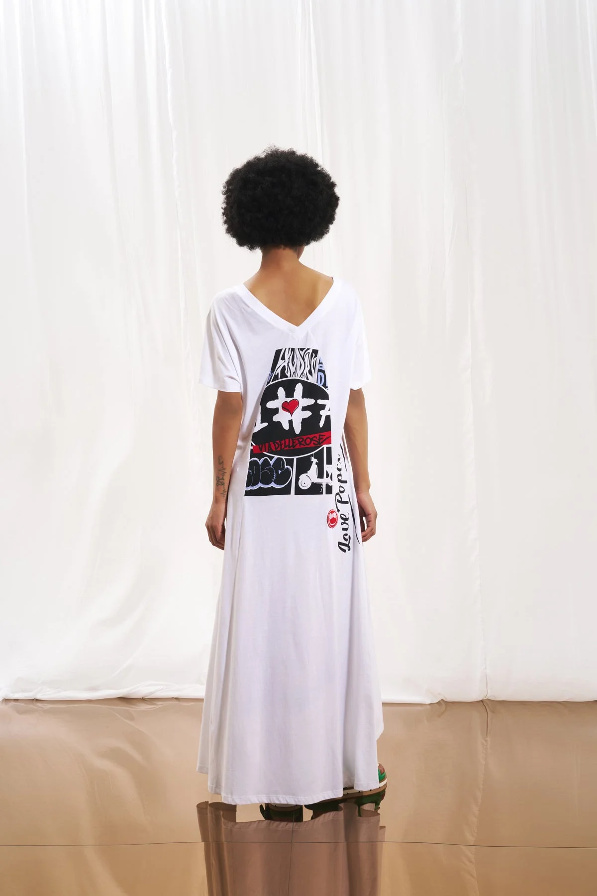 Street Graphic Maxi Tee Dress – Oversized white maxi t-shirt dress with bold graphic prints, V-neck, and side slits. Effortless, trendy, and perfect for laid-back street style.