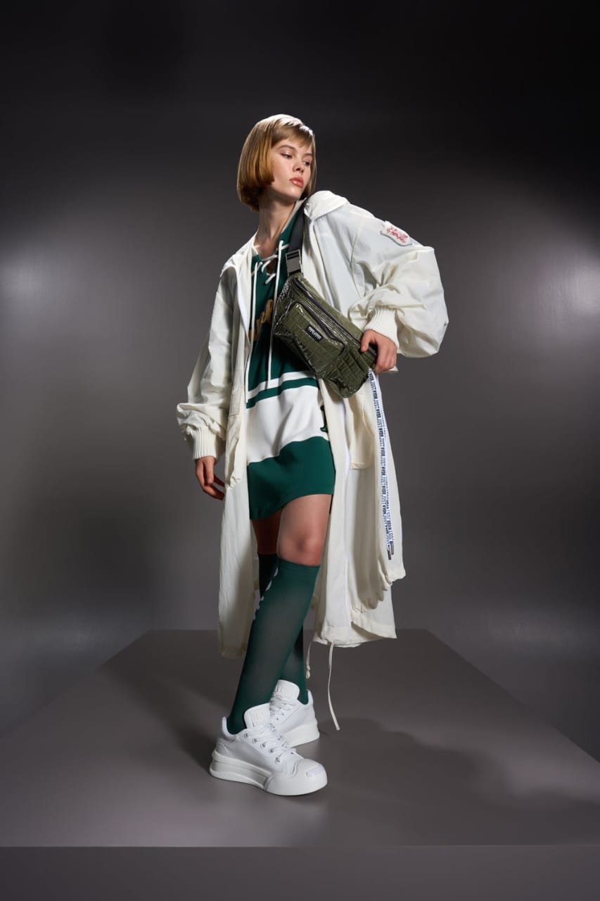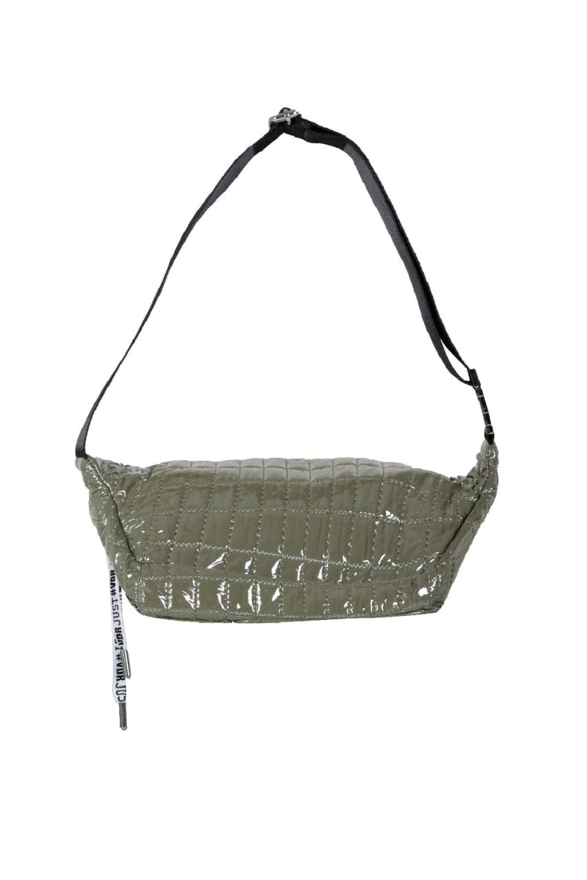 Stay hands-free in style with this olive green quilted waist bag. Featuring a glossy finish, spacious zippered main compartment, and a handy front pocket, it’s perfect for carrying your essentials on the go. The adjustable strap lets you wear it around the waist or crossbody for a sporty streetwear vibe, while the bold branded ribbon pull adds a trendy edge.